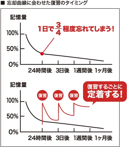 心理学者エビングハウスのある実験によると、20分後には42%、1日後には74%も忘却するという結果がでました。受験勉強の場合、関連づけや語呂合わせによって、74%ということはありませんが、「人は忘れるもの」という前提で勉強しなくてはいけません。